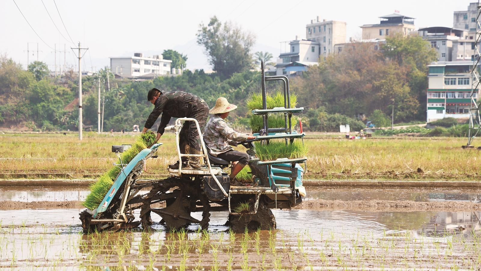 眼下,正值早稻栽插关键期,永德县永康镇2000余亩早稻种植全面铺开,整地、运秧、栽插同步推进,田间地头春耕热潮涌动。图为当地农机人员驾驶载满秧苗的插秧机在田间作业。