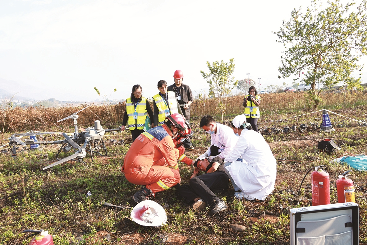 演练现场模拟永德县永康镇送吐村无人机操作员在田间作业时,因对周边环境观察不足,导致无人机挂碰果树树枝后失衡坠落,砸中附近除草群众的一般农机事故,全面检验应急处置全流程。