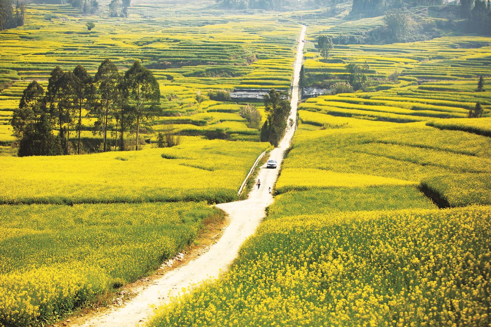 远处,大片金黄的油菜花如一幅巨大的织锦铺展到天边,与青翠的山峦相接,阳光洒在花瓣上,整片花田泛着粼粼金光,像一片燃烧的火焰,热烈却不灼人。忍不住走进花田,任花枝轻扫裤脚,蜜蜂在耳畔嗡嗡低语,忙碌地穿梭于花间,仿佛在为你奏响一曲冬日的田园牧歌。