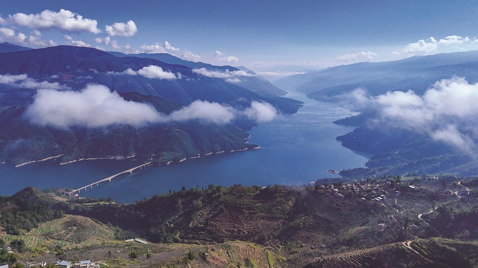 远处,群山层峦叠嶂,在晨雾笼罩下,宛若一幅水墨画;近处,澜沧江水平静如镜,倒映着流云……这是凤庆县境内的“百里长湖”景观,图为青山如画廊,绿水绕村庄的大寺乡河顺村。